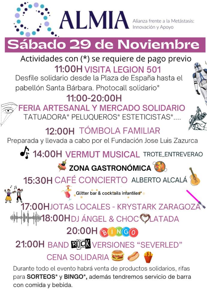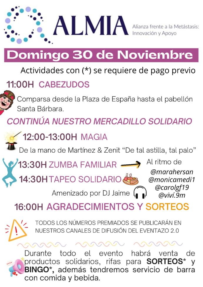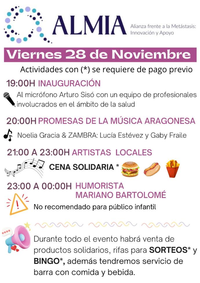 Los días 28, 29 y 30 de noviembre, el Pabellón Santa Bárbara de María de Huerva (Zaragoza) se llena de vida con un fin de semana repleto de actividades para todas las edades: deporte, talleres, música, diversión y mucha solidaridad. Este encuentro nace en colaboración con ALMIA (Alianza frente a la Metástasis, Innovación y Apoyo), con un objetivo claro: